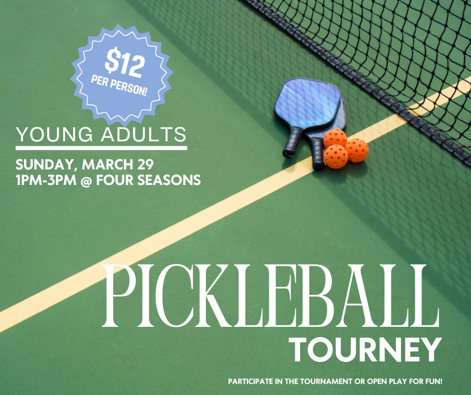 Join us for a fun competition of pickleball! To beat the winter we will be at Four Seasons on Sunday, March 29th from 1pm-3pm! You can either compete in a little competition with a partner for a prize, or have open free play if you’re not the competitive type! Cost is $12 per person! Please sign up below and invite your friends!